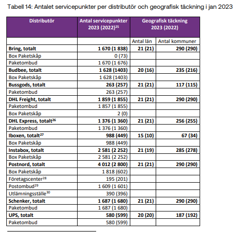 Post- och Telestyrelsen redovisar även hur det ser ut med infrastrukturen för brev och paket i en informativ tabell. Den visar bland annat att transportörsoberoende Iboxen i januari 2023 ställt ut 998 paketskåp, Postnord 1 818, och Budbee och Instabox tillsammans hela 4 209.