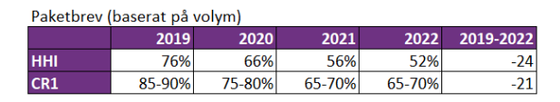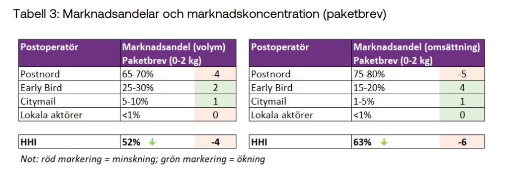 Den nya statistiken visar att Postnord gått från en marknadsandel på 85–90 procent till 65–70 procent sedan 2019. Denna skiljer sig dock stort mellan olika regioner i landet, där Postnord har lägst marknadsandel i Västmanlands och Stockholms län, med 57 resp. 58 procent, och högst i Västerbottens län (78 procent).